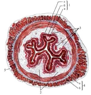 На поперечном разрезе просвет пищевода представляется в виде поперечной щели в шейной части (вследствие давления со стороны трахеи), в грудной части просвет имеет кругловатую или звёздчатую форму. Стенка пищевода состоит из адвентиции, мышечного, подслизистого слоев и слизистой оболочки.